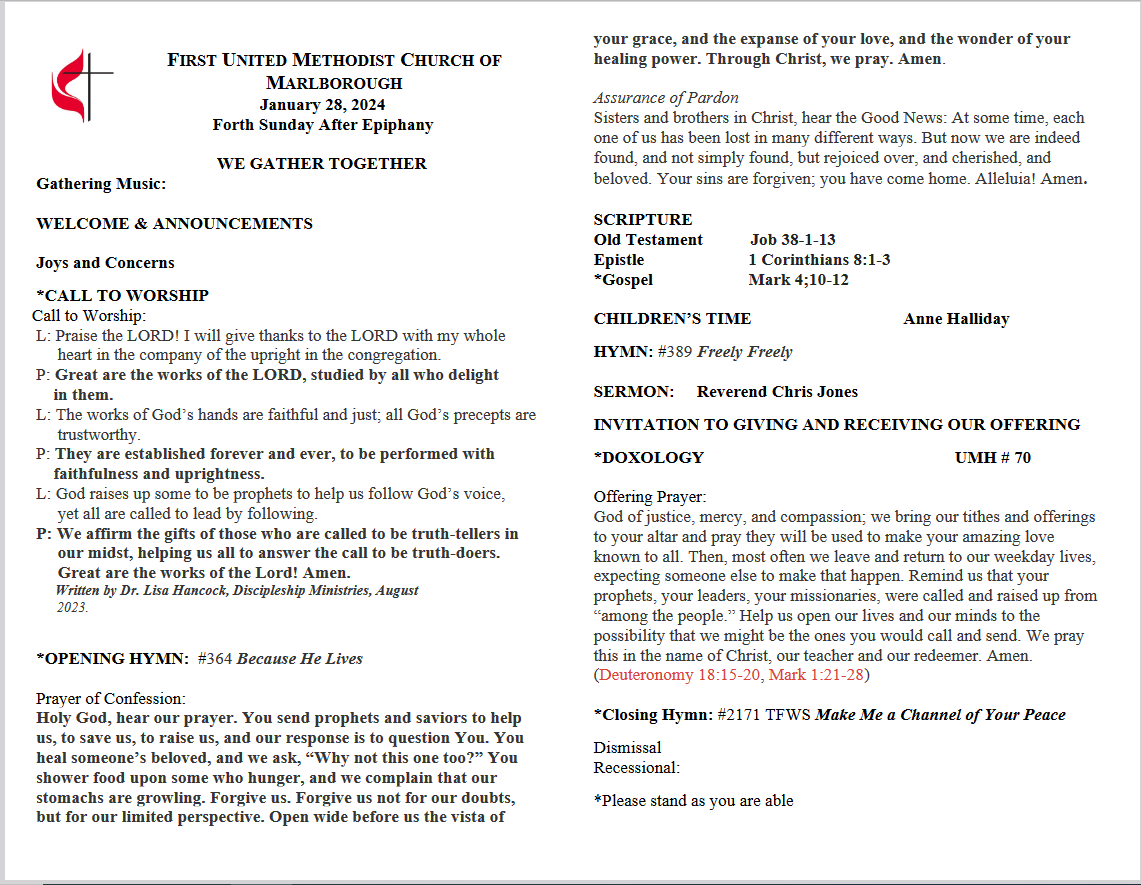Worship Service in the Chapel Sunday, January 28, 2024 9:30 AM 10:30 AM Google Calendar ICS Enter through the back door Bulletin